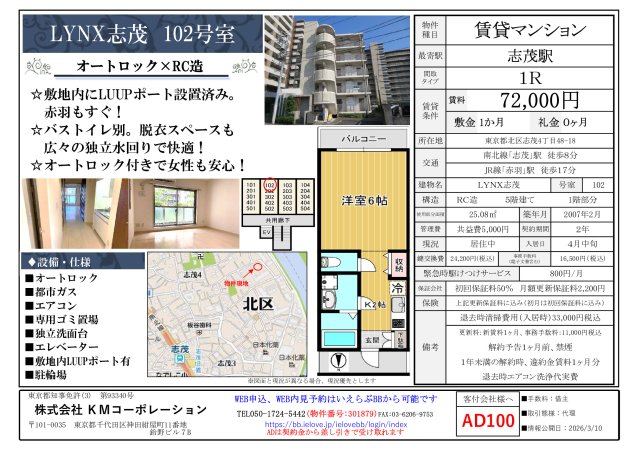맨션 LYNX志茂 102号室 의 매물 상세 페이지. 전국 임대 매물 외국인을 위한 임대정보 · 유학생을 위한 전용 집 찾기라면 YOLO HOME!